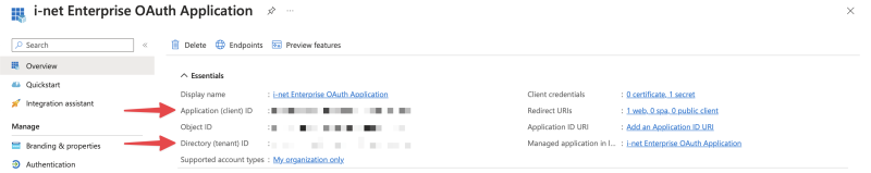 The Client and Tennant IDs are displayed in the overview, directly after creating the application. They are displayed as Application (client) ID and Directory (tennant) ID in the Essentials section of the application, directly below the applications name. Paste the Client and the Tennant IDs into the OAuth Connection dialog.